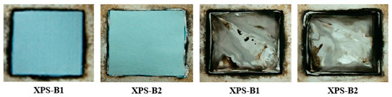The XPS specimens employed in the experiments for thickness are 25 mm and procured from a local supplier in Hefei, China. According to the national standard (GB8624−2012) [26], the samples are classified into two distinct categories: XPS−B1 and XPS−B2. XPS−B1 exhibits a bulk density of 29 kg/m3, whereas XPS−B2 has a slightly denser bulk density of 31 kg/m3. Both types of XPS are treated with hexabromocyclododecane (HBCD) as their flame retardant. The thermal conductivity for these samples is narrowly bracketed between 0.030 to 0.033 W/(m·K), and they are uniformly cut to dimensions of 100 mm × 100 mm to maintain experimental consistency and comparability.