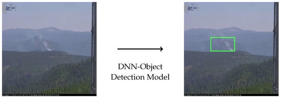 Wildfire smoke detection using deep learning typically involves object detection, a highly established task in computer vision. This consists of identifying and locating an object with a bounding box within an image. The target object is wildfire smoke in this context. Figure 1 illustrates wildfire smoke object detection from surveillance video images using deep learning. To develop object detection models, large-scale deep neural network (DNN)models are trained on image data, usually in quantities well over the thousands for each target object. Using the trained DNN models, smoke objects can be detected in real time, creating a powerful synergy with continuous surveillance. By doing so, automatic prediction systems can be developed which can (1) replace human resources that are expensive and time-consuming, and (2) potentially detect with a higher precision than their human counterparts. In tasks like wildfire detection, which is both costly [] and demands accuracy (see Section 1.2), these advantages of DNNs are particularly desirable.