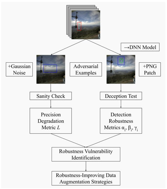 In this section, we introduce the proposed framework, WARP (Wildfire Adversarial Robustness Procedure), for comprehensively assessing the robustness of smoke detection models. WARP generates two types of adversarial examples through data augmentation: global noise (i.e., Gaussian noise) and local noise (i.e., cloud PNG patches). We then compare the original detection (red bounding box) with the perturbed detection (blue bounding box): we conduct a sanity check for the images’ perturbed with global noise, which analyzes the effect of global noise on model precision (see Section 3.1). Additionally, we conduct the deception test for images perturbed with local noise, which analyzes the robustness of the model’s localization and classification abilities on specific objects (see Section 3.2). We later demonstrate in Section 5 that the tests outlined above can identify vulnerabilities in robustness for wildfire detection models, which can produce data augmentation strategies tailored specifically for improving the robustness of DNN models.
