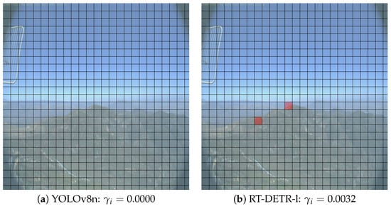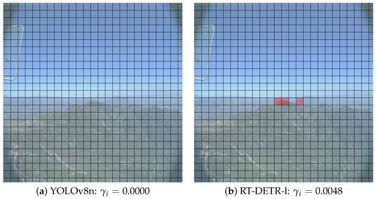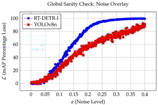 Figure 5 shows the result of the global sanity check as the noise level a is increased in increments of 0.001 from 0.0 to 0.4 over 400 iterations. Interestingly, we observed a substantial difference between the two architectures. Specifically, the mAP percentage loss for the transformer-based RT-DETR-l generally degraded at a higher rate than that of the CNN-based YOLOv8n. for RT-DETR-l converged to ≈100 at noise level , whereas YOLOv8n did not show signs of convergence even after the terminal noise level 0.400 ( and ).
