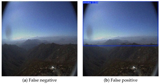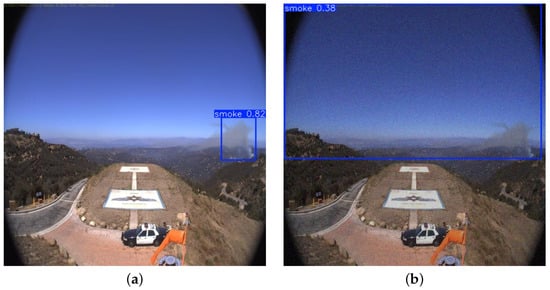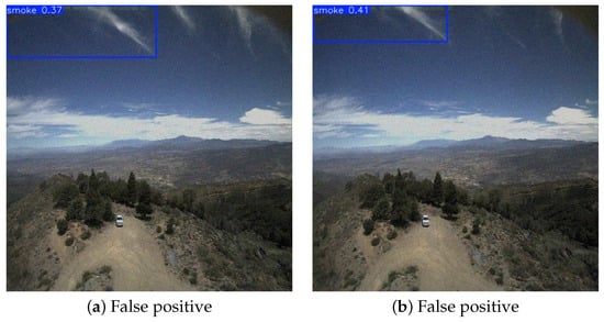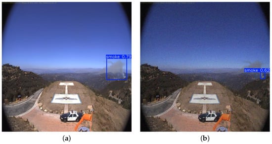 To the naked eye, the noise is barely visible, only appearing as a dimming in image luminosity. There was minimal difference between the performance of the two models without noise (compare Figure 6b with Figure 7a). However, it is important to note that both models suffered in precision. YOLOv8n tended to be more conservative with its detections, only detecting smoke with a definitive white color, or in other words, at a later period of the incipient stage (see Figure 6b). On the other hand, RT-DETR-l did not have this bias but instead began to confuse the sky for smoke with relatively high confidence (see Figure 7b).