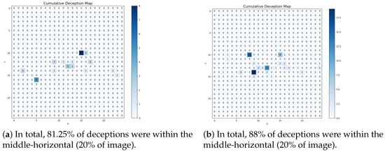 where is the number of detections and its bounding box has (see Equation (A4) for further details) with the injected noise’s bounding box. is the number of attempts, or the number of possible positions for the noise to be injected in a grid (. Since is discrete, is also discrete. That is, is the set of all possible values of , and the set of all possible deception rates is .