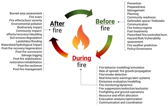 Wildfire science and technology have significantly evolved over the last few decades, encompassing a wide range of themes, topics, and scientific disciplines [1,2], such as forest ecology and climate research, soil and water ecology, community risk assessment, planning and mitigation, wildfire detection and mapping technologies and atmospheric science [2]. According to the Shared Wildfire Governance (SwG) framework proposed by Tedim et al. [3], three main stages can be identified in the “wildfire science loop”: before a fire outbreak, during a fire event, and after extinction takes place. These authors broadly characterized the fields of action for the “before-fire” stage as focusing on prevention, preparedness, and risk reduction through ignition prevention, hazard identification, fuel management, (emergency) planning, vulnerability assessment, community readiness, and fostering resilience by integrating local knowledge and shared governance. The “during-fire” stage emphasizes real-time crisis management, operational coordination, balancing fire suppression with community safety through effective communication, advanced fire modelling/simulation, and evacuation analysis and support. The “after-fire” stage centers on recovery and resilience, addressing losses in multiple aspects, rebuilding infrastructure to mitigate future risks, supporting ecosystem regeneration, and learning from events to inform adaptive strategies. Building on the SwG framework, we adapted and expanded the stages to encompass specific areas, research themes, and topics in wildfire science beyond identifying lines of action associated with each stage—SwG primary focus (for instance, by including fire regime/history in the “before” stage, wildfire detection in the “during” stage, and burn severity or fire effects assessment in the “after-fire” stage; Figure 1; see also Supplementary Materials Subsection S1.1 for details). Among other purposes, these stages can serve as a guiding framework to categorize the science behind preventing, understanding, predicting, and managing wildfires (Figure 1).
