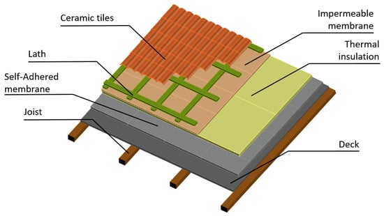These findings complement the research presented in [,], which recommended that the thermal insulation of roofs should always be assembled using materials with a fire reaction ranging from A to B according to [,]. Furthermore, as suggested, the roof structure should not allow contact with the interior of the dwelling, and should preferably be made of reinforced concrete (joist and deck). Recommendations for the roof layers can be found in [], and their assembly should follow this guidance. Also, due to the cracking of the roof tiles caused by firebrand accumulation, it is also necessary to verify the fire resistance of the roof when being impacted by a wildfire, according to []. The roof lath (roof batten) that supports the ceramic roof tiles and promotes its connection to the thermal insulation should also be made of incombustible materials, since the heat transfer due to firebrand accumulation is high.