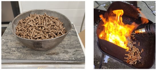 Chapter 7A-4 [,] of the California Building Code provides guidelines that were followed for this test setup, which involves depositing 1.0 kg of firebrands into construction materials or element specimens, which are a ceramic roof tile element used in this study. The roof specimens are equipped with thermocouples (RS PRO-Type K thermocouples, 2.0 m long and 1/0.3 mm in diameter). These thermocouples were strategically positioned on each layer to monitor the transmission of temperature from the firebrands to the specimens. The temperature data are meticulously recorded at a frequency of 1 Hz for a maximum period of 200 min, providing comprehensive data into their behaviour during the cooling stage. In light of findings from multiple research studies [,,,] indicating that compressed wood pellets generate more severe firebrand temperatures, they were chosen to simulate the thermal action of firebrands. The process begins by placing 1.0 kg of firebrands in the metal cup and exposing them to an industrial wind blower to simulate the action of the wind at a speed of (1.31 ± 0.13) m/s, which in turn increases the duration and thermal action of the firebrands, causing a pyrolysis process until achieving full ignition, as illustrated in Figure 2. These firebrands are introduced into a cylindrical ignition control area with a 200 mm diameter and placed on the top according to suggestions from previous studies [] and illustrated in Figure 3a, which found that larger diameters tend to result in greater thermal heat flux and maximum temperatures. The roof specimens had ceramic tile, sub-tile, and thermal insulation materials equipped with eight thermocouples, with two in each layer, while the other roof specimens, equipped with nine thermocouples, had three in each layer, as depicted in Figure 3b.