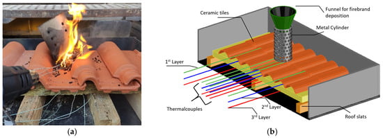 Test setup for firebrand accumulation in construction elements specimens with 3 layers. (a) Roof firebrand accumulation test. (b) Representation of thermocouple location in the roof specimens.