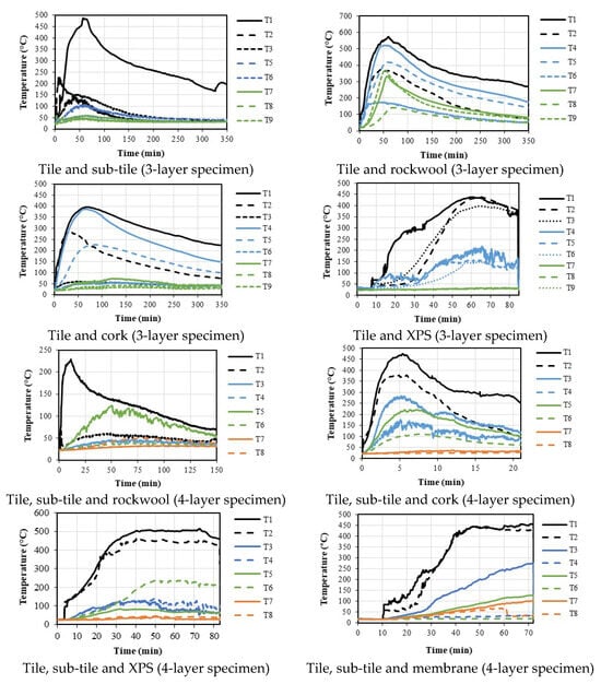 The climatic conditions varied for each test; therefore, the ambient temperature ranged between 20 °C and 30 °C, depending on the day of the experiment, but this had small importance for the thermal output. Figure 4 depicts the temperature measurements obtained from each layer across all tested roof specimens. The results from Thermocouple T5 were excluded from the curve for the tile and sub-tile specimen due to destruction during the test, making the data unreliable. The colours of the first, second, third, and fourth layer are black, blue, green, and orange, respectively, and their positions are depicted in Figure 5.