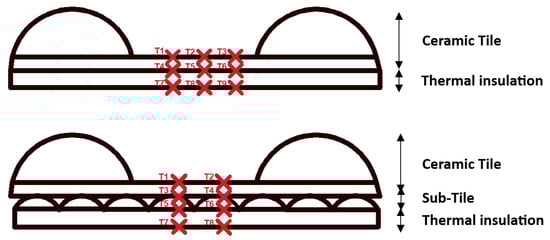 In this study, specimens representing eight roofs were selected, each assemble with a varying combination of materials, as presented in Table 2. The roof specimens, measuring approximately 55 × 30 cm2 per section with the depth varying depending on the material type, were used. Each roof specimen consists of a base layer of tiles, with variations in insulation materials, as show in Figure 1. There was no single combination of ceramic tiles and membranes since the adoption of this single material layer does not abide by the construction code in Europe.