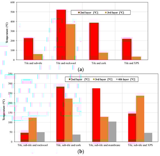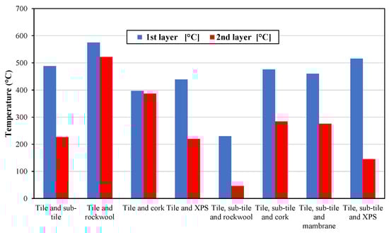 Figure 7 presents the maximum temperature recorded in each layer. From this figure, it is evident that the use of a bituminous sub-tile without any additional thermal insulation provides moderate temperature resistance, reducing the temperature by approximately 73.5% from the second layer to the third layer (from 226.57 °C to 60.04 °C). For combinations of bituminous tile with insulation materials, the temperature in the third layer varied depending on the type of insulation used, but, in general, it was higher than in the specimen without insulation materials. The bituminous tile layer absorbs some heat but does not offer significant thermal insulation.