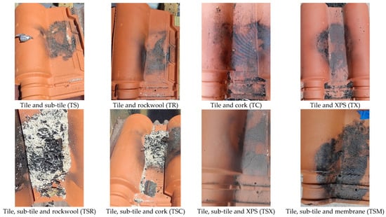 In all specimens, the bituminous tiles were ignited with the same intensity, with some smoke production and droplet production, which are visible in the TSM specimen, see Figure 10. The flow of these droplets could contribute to the temperature increase in the third layer, as can be well observed in the TSR and TSX specimen, as mentioned in Section 4.1. The rockwool and cork in the specimen without a sub-tile underwent smouldering ignition with significant smoke production. In contrast, the rockwool and cork in the specimen with a sub-tile exhibited low-intensity smouldering and minimal smoke production. The XPS reaction was not included in Table 3 because it melted and evaporated at low temperatures in both roof specimens, with and without a sub-tile. This makes tracking its performance difficult, and it can be concluded that it performs very poorly against firebrand accumulation. The impermeable membrane did not produce flame ignition, smoke, or droplets for firebrand accumulation. This later solution, just like in previous studies [], presented a good solution for elevated temperatures due to firebrand accumulation.