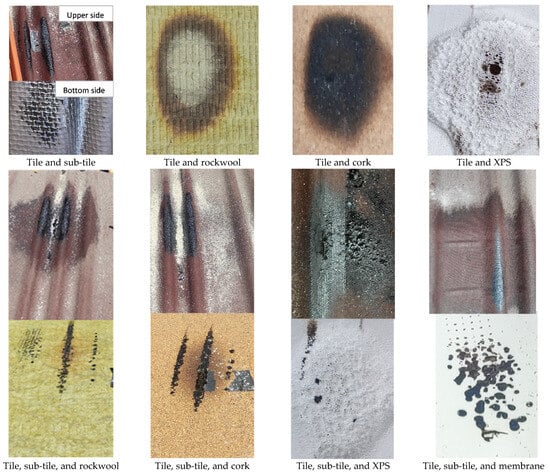The impact of firebrand accumulation on the studied specimens was assessed by analyzing heat penetration in each layer, as shown in Figure 10. It can observed that the impact of firebrand accumulation has reached the surface of the last material in all specimens tested, but creating different levels of damage. The firebrand accumulation caused damage to the sub-tile (bituminous tile) on the upper side with nearly the same severity in all specimens containing a sub-tile, and, on the bottom, the melting of the asphalt was clearly evident. Comparing specimens with and without a sub-tile, it can be observed that in the rockwool and cork specimens, the heat penetration was greater in specimens without sub-tile. Regarding XPS, a similar effect was observed in specimens with and without a sub-tile, except for the presence of small droplets resulting from the melting of the sub-tile. As for the impermeable membrane, categorized by fire reaction as Broof, it had very little effect with the presence of bituminous tile melting drops. It is worth mentioning that specimens containing XPS allowed heat transfer on the last side, unlike specimens containing other materials, where the effect was only on the upper side. The insulation materials like cork and the impermeable membrane presented lower damage due to thermal firebrand penetration.