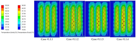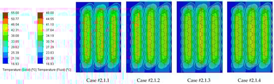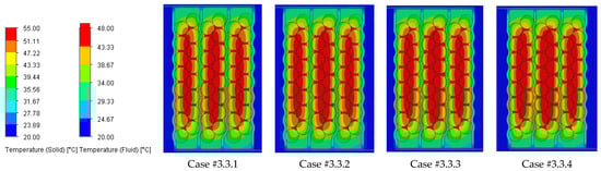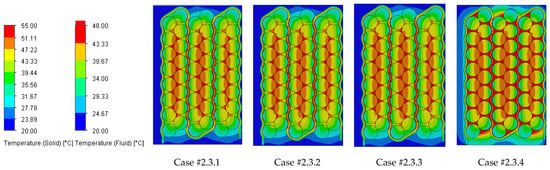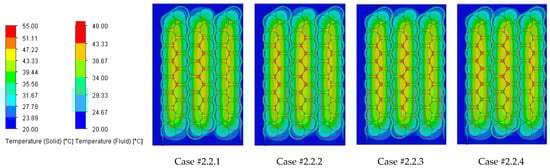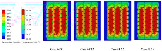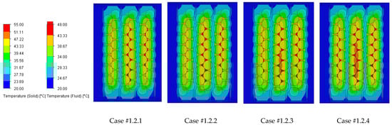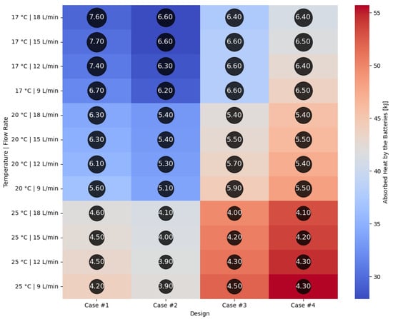 Figure 18 by the colors of the second column from the heatmap, which tend more towards the blue specter compared to the other columns. This is supported by calculating the average value of the heat absorbed by the batteries for every testing combination, which is 36.25 kJ for Case #1, 34.44 kJ for Case #2, 43.98 kJ for Case #3 and 47.82 kJ for Case #4, respectively. This means a difference of 38.8% between the best (Case #2) and the worst (Case #4) design, highlighting the importance of the cooling channels’ structure and configuration for these applications. Despite the overall better cooling performance, the curved paths may introduce additional pressure losses at the end of the rows, added to the ones created by the small flow section due to the presence of four channels, which can affect the system’s power consumption.