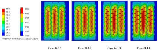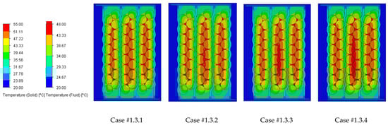 It is also noticed that even though not in all cases, in most of them (9 out of 12 rows), Case #2 offers the smallest temperature gradient and internal resistance difference between the cells. The average difference for every testing combination is 5.96% for Case #1, 5.23% for Case #2, 5.48% for Case #3 and 5.38% for Case #4, respectively. For this criterion, the differences between cases are much smaller, but one should notice that removing a greater quantity of heat does not automatically mean also good thermal uniformity (see changes in order between Case #2 and #4), which highlights the importance of a good balance between these requirements and of a complete thermal analysis when evaluating BTMSs. Despite the single-inlet configuration and, therefore, longer continuous channel, this ensures the same flow rate in all conditions, while flow rate uniformity is difficult to achieve in the various branches of the multi-inlet configurations.