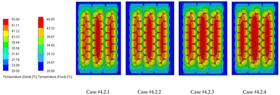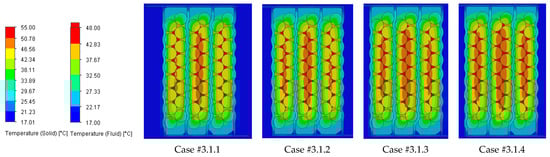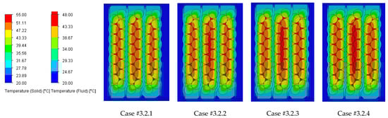 Case #2 features a multichannel serpentine structure, where the serpentine channels are designed to facilitate the circulation of cooling fluid through a network of parallel and curved pathways. This design allows for greater surface contact between the cooling medium and the battery cells, potentially improving heat transfer. The average temperature of all cells for every testing condition combination (flow rate and coolant inlet temperature) is 36.7 °C, slightly lower than that of Case #1 (37.4 °C) and significantly lower than that of Case #3 (41.3 °C) and Case #4 (43.2 °C). This superior heat dissipation can also be observed in