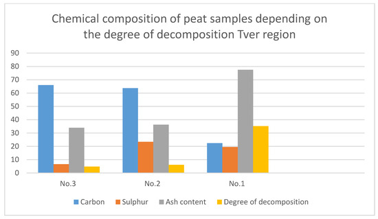 The compositions of samples No. 2 and No. 3 were close in their total organic carbon and ash contents, but sample No. 2 was the most fire-hazardous because it had the highest sulfur content, confirming the data of Jan-Niklas Weber and others [40] from a study of forest fires in Germany.