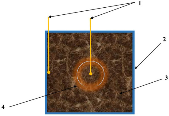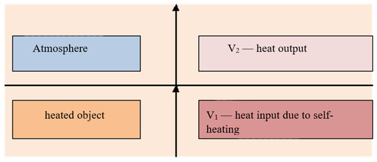 As a result of chemical and energy heterogeneity, materials’ propensity to spontaneously ignite differs, and they have different values of kinetic parameters. The same is typical for peat. Oxidizing processes are exothermic, leading to self-heating of the oxidizing material. When the self-heating mass exceeds the ambient temperature, a cooling process begins. If an organic material is self-heated, the heat dissipation process, particularly its intensity, depends mainly on its geometric size and shape, heat transfer coefficient with the environment, and conditions such as temperature and humidity. Vant-Goff [32] founded our modern scientific understanding of thermal autoignition, which does not result from a sharp increase in the heat release rate at the autoignition temperature, but from an imbalance (in the direction of heat release) between the heat input and output V1 > V2 (Figure 3).