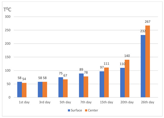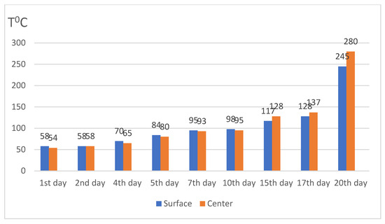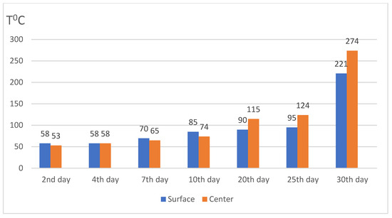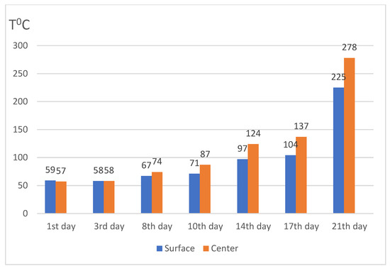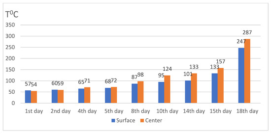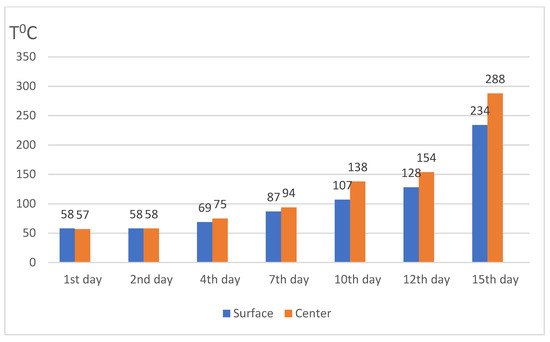 In our experimental studies, after a calibration experiment, the drying cabinet was kept at a given temperature for two hours and, if the readings of thermocouples remained unchanged, then, without adjustments, we proceeded with the tests. Two containers with prepared peat samples from one sampling location, according to Table 1 and Figure 2, but of different densities and thermocouples (Figure 5), were placed in the drying cabinet. The samples were kept there until the onset of spontaneous ignition. The appearance of smoke and a burning smell were considered to signify spontaneous combustion. As shown on all the given graphs of the dynamics of peat sample self-heating, smoldering occurred at extreme values (Figure 6). The samples were removed before the temperature exceeded 300 °C in the thermophysical center, to prevent damage to the installation. After removing the peat containers, the process continued until the samples burned completely, at an ambient temperature of 23 ± 3 °C in the laboratory. Figure 7, Figure 8, Figure 9, Figure 10, Figure 11, Figure 12, Figure 13 and Figure 14 show the average values of daily temperatures simulated in the experimental setup.