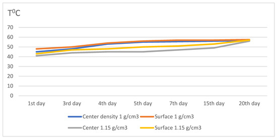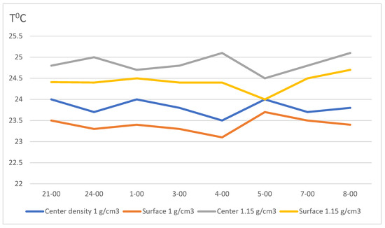 In the experiment, the drying cabinet temperature from 8–00 to 18–00 was maintained at 58 °C, and in the evening and nighttime, the temperature was 23 ± 3 °C, which corresponds to natural conditions. Figure 9 shows peat soil’s temperature change at night, that is, after the experimental setup was turned off, when the ambient temperature in the laboratory was 23 ± 3 °C. We can see that the denser sample kept a higher temperature than the less dense sample. The thermophysical centers in both variants were warmer than the ambient and surface temperatures of the samples, which indicates that the self-heating process occurred. Peat soils are considered cold, and an increase in peat density warms them, favoring agricultural crop cultivation. According to Figure 10, this effect was observed in our experimental studies with samples No. 2 and No. 3.