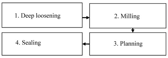 Drained peatlands after peat mining are the most hazardous. In these settings, it is common practice to leave a 60–70 cm residual peat layer for subsequent use. In these conditions, the technological operations required to change the volumetric density of the peat layer using a complex of machines are as shown in Figure 15.