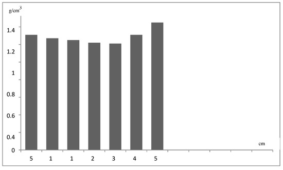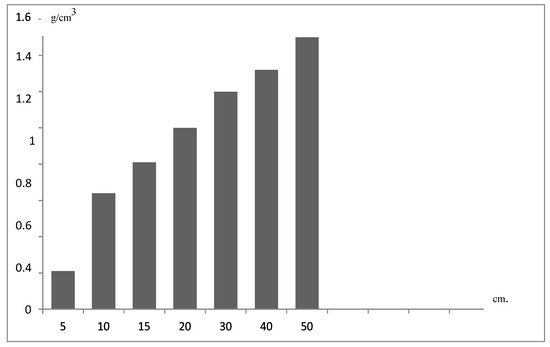 Peat density by depth after the full cycle of the technical stage of reclamation.