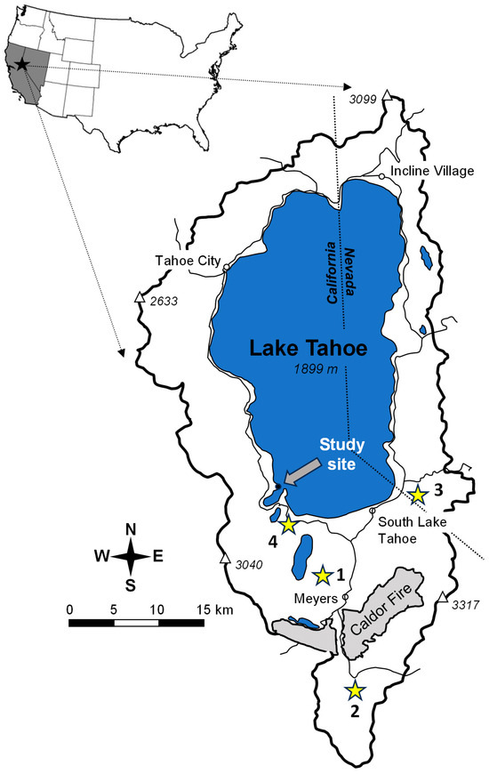 Location of the Emerald Point study site in the Lake Tahoe Basin, California and Nevada, USA (black dot at end of the arrow). Outer polygon indicates the boundary of the USDA-Forest Service Lake Tahoe Basin (LTB) Management Unit. Stars numbered 1, 2, 3, and 4 represent the locations of the 2007 Angora Fire, 2002 Showers Fire, 2002 Gondola Fire, and 2018 Emerald Fire, respectively. 2021 Caldor Fire indicated by gray polygon.
