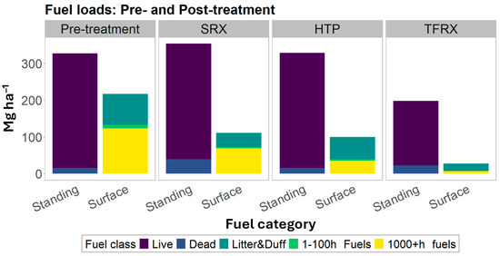 Pre- and post-treatment fuel loads, before simulation of the wildfire. Standing fuels are divided into live and dead standing fuel, and surface fuels are divided into four categories: litter and duff combined; 1–100 h fuels; and ≥1000 h fuels (CWD).