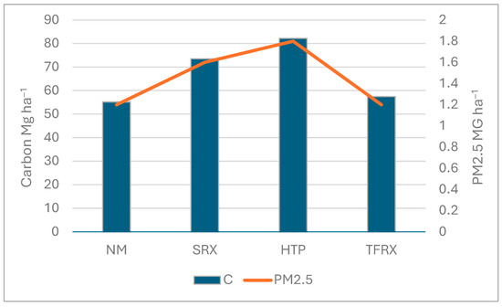 The simulated prescribed fire in the SRX treatment was estimated to release 34.1 Mg ha−1 C (Figure 8) and 0.7 Mg ha−1 PM2.5. The TFRX prescribed fire released 47.2 Mg ha−1 C and 0.9 Mg ha−1 PM2.5. The HTP prescribed fire released 53.7 Mg ha−1 C (Figure 8), but we do not have PM2.5 emissions for this treatment, as FVS only provides that metric for broadcast burns and wildfire. Assuming the same C/PM2.5 ratios as in the other treatments, a rough estimate would be about 1.1 Mg ha−1 of PM2.5 for HTP.