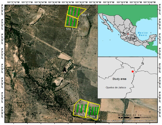 Location map of the study area in the Llanos de Ojuelos, Jalisco, Mexico. The study site is marked in yellow, while the sampling plots are shown in green.