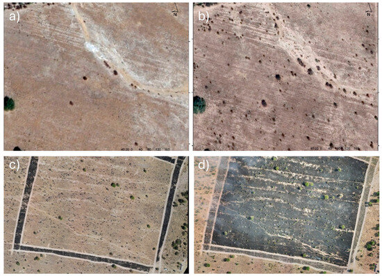Changes in shrub abundance in the experimental site. Images correspond to the years 2011 (a) and 2022 (b; Google, s.f.). Aereal view of one of the four sites before (c) and after (d) the burning treatment. The black contour in the left image is the protection line, which was made one week before the prescribed burning.