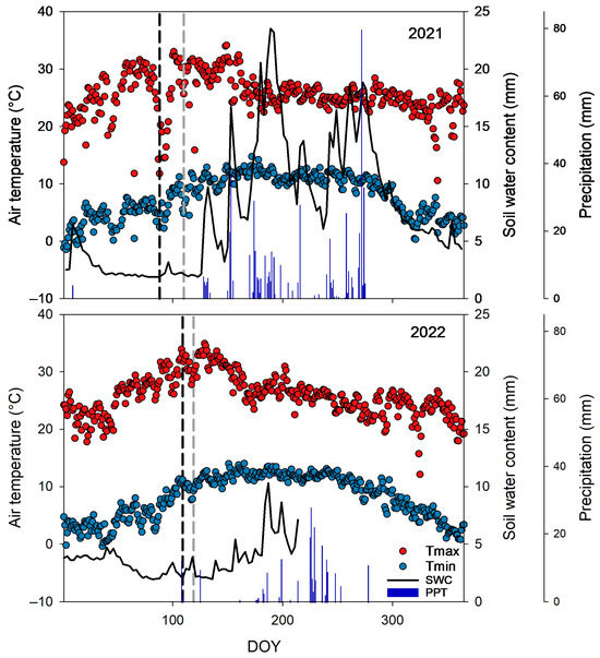 Environmental and soil water content (SWC) conditions observed in the two years of the prescribed burnings. Vertical dashed lines stand for dates of fire application; black and gray for sites 1 and 2, respectively, in 2021, and black and gray for sites 3 and 4, respectively, in 2022. Maximum and minimum temperatures (Tmax and Tmin, respectively) and precipitation (PPT).