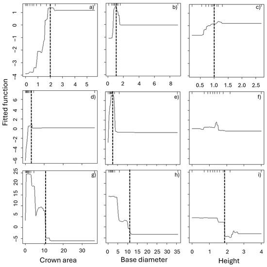 For Vachelia shrubs, 84% of individuals suffered 100% of damage, and 13% of them did not show resprouts; we assumed that these shrubs were dead. The number of resprouts increased with the base diameter and with the crown area (Figure 5d,e). Larger (in size and crown area) shrubs showed a lower number of resprouts because they were less affected by fire. The most influential variable on fire damage was crown area, contributing 53% to the relative influence, followed by diameter and total height (24% and 22%, respectively; Table 2; Figure 5g–i). Site, crown and stem shape did not significantly affect damage levels and were therefore excluded from the final regression trees.