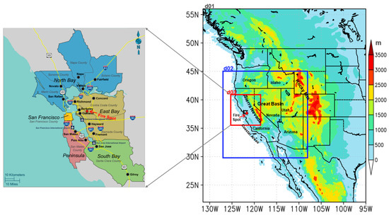 Domain set up for the East Bay Hills Fire (1991) with three nested domains with grid resolutions of 16 km (d01), 4 km (d02), and 1 km (d03). On the left-hand side is the zoomed-in view of the San Francisco Bay area and the East Bay Hills Fire location.