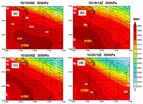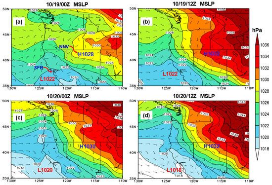 As the day progresses, sunlight penetrates the clouds and warms the surface and air above. This warming decreases the relative humidity of the cloudy air, and clouds begin to evaporate. Strong winds above the clouds can mix in drier air, leading to more evaporation, then the marine layer will dissipate [38]. The slow destruction of the marine layer gives rise to drier and warmer air near the coastal areas, and the increasing temperatures lower mean sea level pressures (MSLPs) along the coast. This lowering of MSLPs along the California coast produced an intensifying south to southwestward-directed pressure gradient across northern California through the weekend of 19 and 20 October (Figure 3). From the MSLP in Figure 3, the pressure difference between the San Francisco Bay (SFB) area and northern Nevada (NNV) was about 6–10 hPa from 10/19/00Z to 10/19/12Z. Twenty-four hours later, the MSLP along the California coast had fallen by 4 hPa or more. At the same time, the MSLP difference between the San Francisco Bay area and northern Nevada had increased to 10–14 hPa (Figure 3).