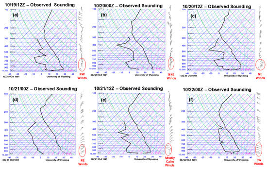 At 5:00 AM PDT on 20 October, a comparison was made between the 500 mb heights over San Francisco Bay and those from 19 October at 5:00 PM PDT. The results showed that the heights were lower due to the retrogression of the upper ridge. This retrogression supported more north-to-northeasterly flow at upper levels, as evidenced by Figure 4b,c. Consequently, the upper-level flow over the Great Basin became stronger. At the same time, the increasing Intermountain West MSLP gradient intensified the low-level winds generated by the low-level southwestward-directed/offshore pressure gradients. On 20 October at 11:00 AM PDT, the National Weather Service (NWS) reported that the shallow marine layer near Oakland’s surface dissipated. This finding suggests that the observed changes in the 500 mb heights over San Francisco Bay from the previous day’s measurements may have contributed to the dissipation of the shallow marine layer. The surface wind increased drastically, the temperature increased to ~13 °C in one hour (the highest temperature recorded for the day), and the dew point temperature fell to ~9 °C [39]. These phenomena coincided with the initial blowup of the main fire complex at this time. The MSLP gradient lowered during the daytime as the northern Rockies and Great Basin surface pressures dropped. Eventually, as the MSLP gradient lowered around the San Francisco Bay (SFB) area, the support for northeasterly winds decreased during the day. Nevertheless, the strong winds continued in Oakland into the evening, and this can be seen in the observed Skew-T plot showing moderately strong winds (15–20 knots) at the surface and dissipation of the marine layer (Figure 4d). Afterward, the pressure gradient decreased, and the surface winds in the East Bay Hills area weakened substantially and turned to the west-northwest by 10/21/12Z (Figure 4e). Later, the west-northwesterly wind shifted to a southwesterly wind, causing a moist marine layer to enter the East Bay Hills fire area during the day, which helped lessen the fire (Figure 4f).