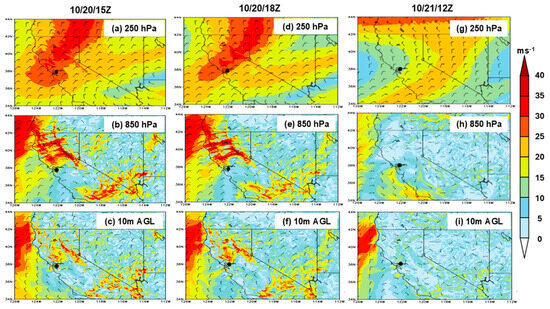 WRF (d02) simulated wind speeds (shaded; ms−1 and directions (wind barbs) at various levels during the fire event’s start time between 10/20/15Z and 10/20/18Z, peak time between 10/20/18Z and 10/20/20Z, and extinguished the next day 10/21/12Z: 250 hPa (a), 850 hPa (b), and 10 m winds above the ground (c) at 10/20/15Z (left panels), 10/20/18Z (middle panels), and 10/21/12Z (right panels). Note that at the fire location (denoted with a black dot), the simulated winds from the surface up to 250 hPa are predominantly northeasterly (panels a–g) and moderately strong winds at the surface (12–14 ms−1, panels c,f), which are consistent with those observed (Figure 4c,d) from 10/20/15Z to 10/20/18Z, creating a highly favorable environment for fire spread. The winds then turn to a south-southwesterly flow during 10/21/12Z (panels h,i), consistent with those observed (Figure 4e,f).