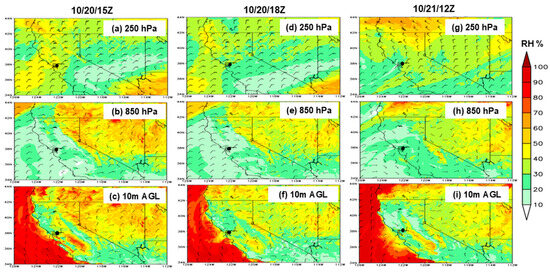 WRF (d02) simulated RH (shaded; %) and directions (wind barbs) at various levels during the fire event’s start time between 10/20/15Z and 10/20/18Z, peak time between 10/20/18Z and 10/20/20Z, and extinguishing the next day 10/21/12Z: 250 hPa (a), 850 hPa (b), and 10m winds above the ground (c) at 10/20/15Z (left panels), 10/20/18Z (middle panels), and 10/21/12Z (right panels). Note that at the fire location (denoted with a black dot), the simulated winds from the surface up to 250 hPa are predominantly northeasterly (panels a–g). Additionally, near the fire site, the surface air was more humid (RH at 60–70%, panels c,f,i), but it was drier in the 850 hPa layer (RH at 10–20%, panels b,e,h), which indicates that the lower tropospheric air (surface to 850 hPa) advected drier air toward the ocean.