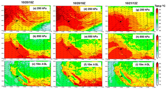 WRF (d02) simulated temperature (shaded; °C) and directions (wind barbs) at various levels during the fire event’s start time between 10/20/15Z and 10/20/18Z, peak time between 10/20/18Z and 10/20/20Z, and extinguishing the next day 10/21/12Z: 250 hPa (a), 850 hPa (b), and 10 m winds above the ground (c) at 10/20/15Z (left panels), 10/20/18Z (middle panels), and 10/21/12Z (right panels). Note that at the fire location (denoted with a black dot), the simulated winds from the surface up to 250 hPa are predominantly northeasterly (panels a–g). Additionally, during the fire’s start time, the surface temperature rose consistently from 24 to 32 °C (75–90 °F) (panels c,f,i), which helped to strengthen the fire intensity, with winds shifting to a south-southwesterly flow during 10/21/12Z (panels h,i), consistent with those observed (Figure 4e,f).