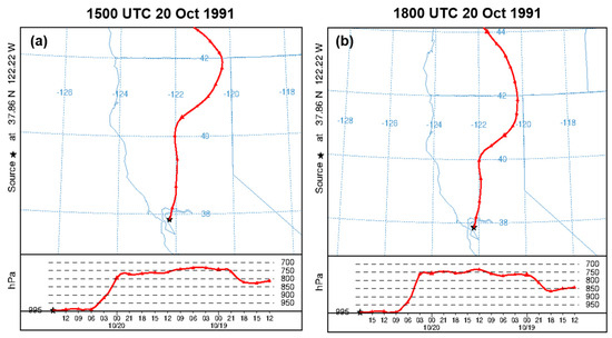 The synoptic-scale and mesoscale environment interaction is examined using backward trajectories from the NOAA Hybrid Single Particle Lagrangian Integrated Trajectory (HYSPLIT) model [40,41]. The HYSPLIT model is a complete system for computing simple air parcel trajectories and complex transport, dispersion, chemical transformation, and deposition simulations. It is used for back trajectory analysis to determine the origin of air masses and establish source–receptor relationships. This study used the HYSPLIT model to compute the East Bay Hills fire trajectory at a particular location (37.86 N, 122.22 W) and date (10/18/12Z) where and when the fire occurred, respectively. We first discuss trajectories to indicate that air from the jet streak does not directly impact the fire location but does so indirectly by creating a more favorable mountain wave genesis and amplification environment. The trajectories are all initialized with NARR data starting at 1500 UTC 20 October 1991 (Figure 8a) and 1800 UTC 20 October 1991 (Figure 8b). They all end at 1200 UTC 18 October 1991. We use the backward trajectory analysis to describe the air parcels’ source arriving at the location of interest.