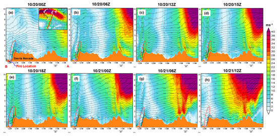 Cross-section along AB (denoted in the upper-right corner) from the WRF (d01) simulation of wind speeds (shaded; ms−1), isentropes (contour lines; K), and wind barbs from 10/20/00Z to 10/21/12Z, 1991, for every 6 or 3 h, as shown on top of each figure panel (a–h). The cross-section line passes through the jet streak’s right exit region and the fire location at 250 hPa level. This analysis indicates that downward motion associated with the jet streak at the exit region is far from the fire location (a–h). Thus, the downslope wind on the lee side of East Bay Hills did not seem to be affected by the jet streak directly.