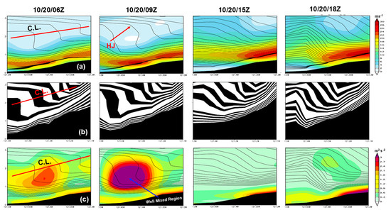 Vertical cross-section at the lee side of Sierra Nevada using the WRF (d02) simulation of (a) isotachs (shaded; ms−1) and isentropes (contour lines; K), (b) isentropes (shaded; K), and (c) TKE (shaded; m2s−2) and isentropes (contour lines; K) from 10/20/06Z to 10/20/18Z. CL and HJ represent critical level and hydraulic jump, respectively. Note that the three distinct stages for forming severe downslope winds, as proposed in the resonant amplification mechanism [13,38], and the hydraulic jump and well-mixed (dead) region, as proposed in the hydraulic jump mechanism [14], can be identified in this analysis. Detailed discussions can be found in the relevant text.