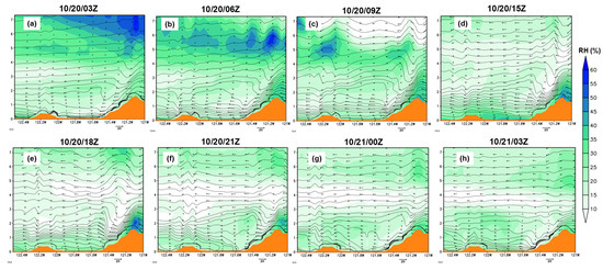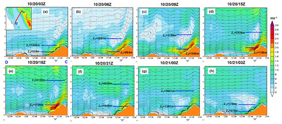 Based on the resonant amplification mechanism by CP84 [13], the lowest wave-induced critical level starts to develop at height z = 3λz/4 + n. Using the WRF simulated results, the lowest wave-induced critical levels at times 10/20/03Z, 10/20/06Z, 10/20/09Z, 10/20/15Z, 10/20/18Z, 10/20/21Z, 10/21/00Z, and 10/21/03Z are 1585, 2651, 3199, 3554, 5159, 4925, 3621, and 1709 m, respectively (Figure 11). The CL height is estimated by first calculating the hydrostatic vertical wavelength (λz).