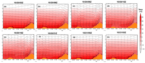 Cross-section along line CD (denoted in Figure 11) from the WRF (d02) simulated temperature (shaded; °C), isentropes (contour lines; K), and wind barbs from 10/20/03Z to 10/21/03Z. Note that the high-temperature layer near the surface (a,b) at the Central Valley became relatively colder than the air above (~2 km) (c–e), due to the sinking air motion associated with the high-pressure system extending southwestwards from the Great Basin offshore decreases the depth of the marine layer. Panels (f–h) illustrate that wind speeds decreased, revealing weaker winds on the leeside of the Sierra Nevada when the fire was contained. Refer to the text for a more detailed discussion.