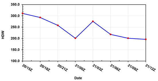 Time series of the HDW using WRF (d02) simulated data at the fire location (122.22 W, 37.86 N) from 10/20/15Z to 10/21/12Z. Along with Figure 14, the high HDW set the pace for favorable wildfire conditions, which started around 10/20/1740Z, 1991. At 10/21/03Z, the HDW increased again due to daytime heating. Later, the HDW reduced until the end of the simulation period.