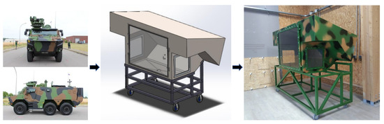 The test bench compartment represents a 1:1-scale military vehicle engine compartment with certain simplifications applied. Due to limited access to precise data regarding military vehicles, we designed the compartment based on approximations derived from publicly available images on the internet [30]. It has a volume of approximately 2.44 and lacks ventilation. The dimensions of the compartment are 1.3 m in length, 1.25 m in height, and 2.5 m in width. The compartment has a large main window and two smaller side windows to allow visual feedback during the experiments. The design process was carried out using Solidworks 2019 software, with the input being images of the military vehicle, which formed the foundation for our design. We began by selecting online images that provided comprehensive front, side, and top views of the military vehicle. These images served as references for creating our compartment design. We cropped out the relevant sections to extract the vehicle’s dimensions from the selected images, excluding any background or extraneous elements. These cropped images were then imported into SolidWorks.