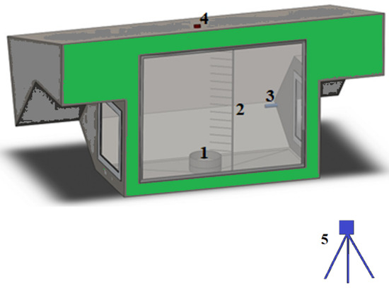 Schematic view of the experimental setup in the fire test of a well-confined compartment: (1) fuel pan, (2) thermocouple tree, (3) gas analyzer probe, (4) total heat flux sensors, and (5) camera.