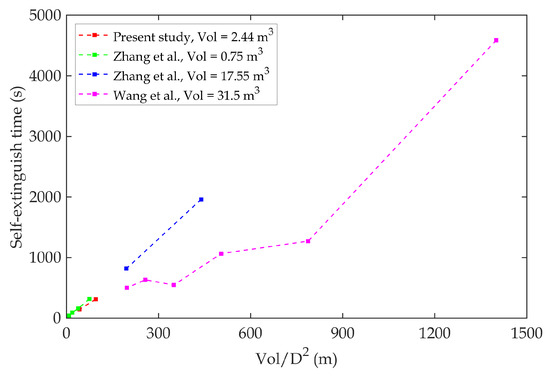 Comparison of self-extinction time as a function of volume to the squared diameter with results from Zhang et al. [31] and Wang et al. [3].