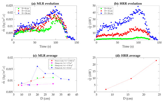 (a) Temporal evolution of mass loss rate (MLR). (b) Temporal evolution of heat release rate (HRR). (c) Average mass loss rate (MLR) as a function of pan diameter (D). (d) Average heat release rate (HRR) as a function of pan diameter (D).