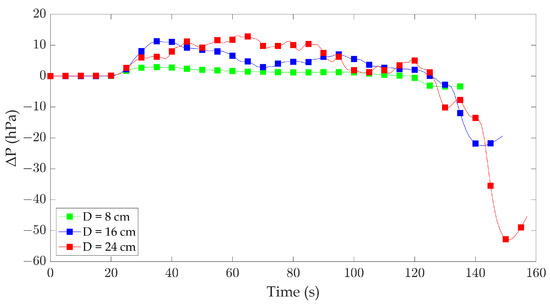 Larger fires pose greater risks due to higher heat release rates, which increase heat flux, average compartment temperatures, and oxygen consumption, resulting in elevated pressure differences between the interior and exterior compartments [35]. Figure 6 shows the pressure differences between the interior and exterior compartments for 8 cm, 16 cm, and 24 cm pans. Distinct patterns of pressure variations were observed for each pan diameter, revealing the compartment’s dynamic behavior during fire and extinguishment. For the 8 cm diameter pan, the pressure inside the compartment experiences a minor increase towards the outside of the compartment during the fire, approximately of about 2.9 hPa. However, upon extinguishment, the pressure drops to approximately 3.4 hPa less than the outside pressure. This indicates a relatively minimal pressure difference between the interior and exterior of the compartment after the fire has ceased.