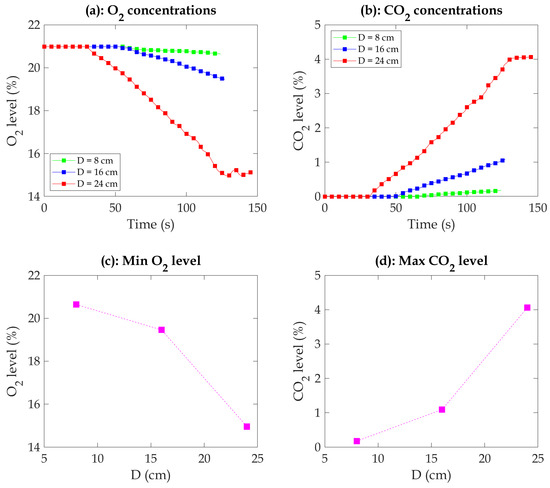 (a) Temporal evolution of oxygen (O2) concentrations. (b) Temporal evolution of carbon dioxide (CO2) concentrations. (c) Minimum oxygen (O2) level as a function of pan diameter (D). (d) Maximum carbon dioxide (CO2) level as a function of pan diameter (D).