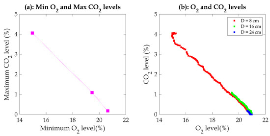 (a) Relationship between minimum oxygen (O2) and maximum carbon dioxide (CO2) levels. (b) Correlation between oxygen (O2) and carbon dioxide (CO2) levels over time.